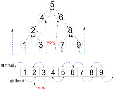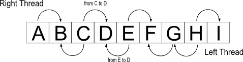 "A binary tree is threaded by making all right child pointers that would normally be null point to the in-order successor of the node (if it exists), and all left child pointers that would normally be null point to the in-order predecessor of the node."[1]