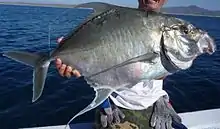 The threadfin jack is of some importance to fisheries throughout its range, although individual catch statistics for the species are not kept. It is often caught by hook-and-line methods or by gill nets and various artisanal traps. It is considered to be good to excellent table fare, and is marketed both fresh and salted.[8] The species has also been found at a number of archaeological sites in both Panama and Ecuador, indicating it has been caught by humans for food for at least 3450 years.[11][14] The threadfin jack is also of interest to anglers who catch the species occasionally, and is considered a minor gamefish. Juveniles are occasionally caught from shore, such as piers and breakwaters, while larger individuals are caught over deeper reefs. The species takes a variety of bait, including fish and prawns, but they also take lures, including hard and small, fly-like Sabiki lures.[12]