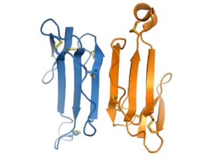 Most 3FTx proteins are monomers. However, some 3FTx subgroups form functional non-covalent homodimers.[2] The kappa-bungarotoxin group is the best characterized dimeric 3FTx, and interacts through an antiparallel dimer interface composed of the outer strand of loop III.[7] Haditoxin is another example of a dimeric 3FTx; it is a member of the short-chain group and has a similar dimer interface but distinct pharmacology compared to the long-chain-like kappa-bungarotoxins.[9]