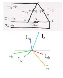 Relative angles are preserved, so I31 lags I23 lags I12 by 120°. Calculating line currents by using KCL at each delta node gives: