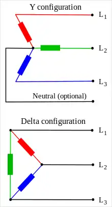 There are two basic three-phase configurations: wye (Y) and delta (Δ). As shown in the diagram, a delta configuration requires only three wires for transmission but a wye (star) configuration may have a fourth wire. The fourth wire, if present, is provided as a neutral and is normally grounded. The three-wire and four-wire designations do not count the ground wire present above many transmission lines, which is solely for fault protection and does not carry current under normal use.