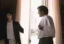 The figure is actually a cardboard cutout "standee" of Jack, wearing a tuxedo and top hat, that was left on the set. It was created as part of the storyline, in which he, an actor, appears in a dog food commercial, but this portion was cut from the final version of the film. The standee does show up later in the film, when Jack stands next to it as Sylvia comes to reclaim Mary. Snopes.com contends that the one in the first scene looks smaller from its appearance in the later scene because of the distance and angle of the shot, and because the curtains obscure its outstretched arms. As for the contention that a boy died in the house, all the indoor scenes were shot on a Toronto sound stage, and no kind of residential dwellings were used for interior filming.[5][6]