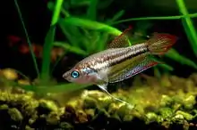 The threestripe gourami normally shows one or two, almost never three, dark stripes running the length of its body but there it lacks any strip along the base of the anal fin. The elongated reare anal fin rays do not reach beyond the middle of the caudal fin which is lanceolate in shape. The dorsal, anal and caudal fin have red margins and are marked with many blue spots.[2] Males are larger than the females and have elongated rays in the pelvic, dorsal, anal, and caudal fins.[3] It can attain a length of 4 centimetres (1.6 in)[4] with the largest males measured at 5 centimetres (2.0 in).[2] It is intermediate in size between its congeners, being smaller than the croaking gourami (Trichopsis vittata) and larger than the pygmy gourami (T. pumila).[4]