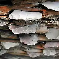 Patricia C. Anderson (of Centre d’Etudes Préhistoire, Antiquité et Moyen Age del CNRS), discovered archaeological remains that demonstrate the existence of threshing boards at least 8,000 years old in the Near East and Balkans. The artefacts are lithic flakes and, above all obsidian or flint blades, recognizable through the type of microscopic wear that it has. Her work was completed by Jacques Chabot (of the Centre interuniversitaire d'études sur les lettres, les arts et les traditions, CELAT), who has studied Mitanni (northern Mesopotamia and Armenia). Both count among their specialties the study of microwear analysis, through which it is possible to take a particular piece of flint or obsidian (to take the most common examples) and determine the tasks for which it was used.[7] Concretely, the cutting of cereals leaves a very characteristic glossy pattern of wear, owing to the presence of microscopic mineral particles (phytoliths) in the stalks of the plants. Therefore, scholars using controlled experimental replication studies and functional analysis with a scanning electron microscope are able to identify stone artefacts that were used as sickles or the teeth of threshing boards. The edge damage on the pieces used in threshing boards is distinct because, besides the glossy abrasion characteristic of cutting cereals, they have micro-scars from chipping, as a result of the blows of the threshing board against the rock surface of the threshing floor.[8]
