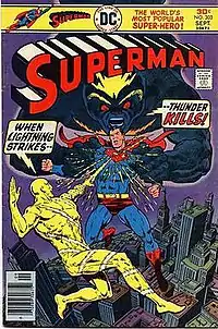An unrelated Thunder and Lightning appeared as Superman villains in Superman #303 (September 1976). These were actually two entities in the body of a sentient android used by a super-villain called Whirlicane (who had previously fought Superman in Action Comics #457), who wanted to conduct a series of terror acts across the US. Not knowing about his android origin, Thunder/Lightning hoped for his release by Whirlicane when his tasks were finally fulfilled, but then Superman exposed the truth. Going mad over the realization, Thunder/Lightning released a massive lightning burst, destroying himself, Whirlicane and his base; Superman escaped unscathed.[11]