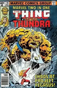 She later battled the Hulk, who was possessing the Thing's body at the time.[5] Thundra later assisted the Fantastic Four against the Frightful Four again,[6] and then assisted the Fantastic Four against Namor the Sub-Mariner.[7] Her time travel from 23rd Century Femizonia, an alternate future Earth ruled by women, to prevent the formation of Machus, a planet in her alternate future dimension ruled by men, was finally revealed. Alongside the Fantastic Four, she battled Mahkizmo. She ultimately remained in the 20th Century after a dimensional interface of Femizonia and Machus occurred.[8] She later assisted the Fantastic Four and Tigra against the Frightful Four,[9] and then assisted the Fantastic Four, Tigra, and the Impossible Man against the Brute, Mad Thinker, and Annihilus.[10]
