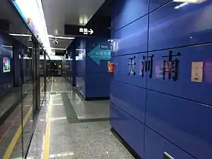 Tianhenan Station (Chinese: 天河南站; pinyin: Tiānhénán Zhàn; Jyutping: tin1ho4naam4 zaam6), formerly Tianhe 1st Road South Station (天河南一路站) during planning, is a metro station on the Guangzhou Metro APM line. It is located under the interchange of Tianhe 1st South Road (天河南一路) and Liuyun 2nd Street (六运二街) in the Tianhe District.[1] It started operation on 8 November 2010.[2][3] The station is unique in being the only station in Guangzhou with no escalator access to the platforms - instead 4 lifts carry passengers from the concourse to the platform although there is a staircase for emergency use.