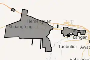 ![]() Map of Tiemenguan. The Western portion and the small enclave next to it are part of Shuangfeng Town and the eastern enclave is Boguqi Town. | |