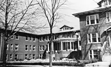 The Patient Apartments Building was the first of the five buildings to be designed and constructed specifically for the Tilden School. It was built in 1916 and is located north of the Bosler-Yankee House Administration Building at 3279 Grove Street.[43] It was designed by prominent Denver architect Harry W.J. Edbrooke.[44] The Patient Apartments Building featured fully furnished apartments where patients could reside while learning Tilden's techniques to restore health.[2] The building was designed in the Classical Revival Style and incorporated elements more commonly found in residential construction than medical facilities. The three story brick building has a hipped roof and a central circular two story portico.[14] The building in approximately 100 feet in length and the front 40 foot portion is approximately 50 feet wide with the remainder of the building approximately 48 feet in width.[27][45]