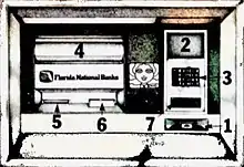 Tillie the All-Time Teller machines were red and gold to make them look more attractive.[2] On the bottom left was the place to enter an "access card," which featured a cartoon character.[2] Above that was a place to enter a "secret code" that the customer chose.[2] On the bottom center was a picture of a cartoon blonde girl with china-blue eyes[1] and a red hat. Above that was the place it handed out cash and coins. On the top right was the place to enter a desired amount of money.