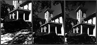 - In the center photo, the same camera is tilted up to take in the whole house. The building appears to lean backwards.