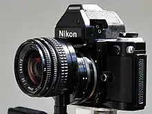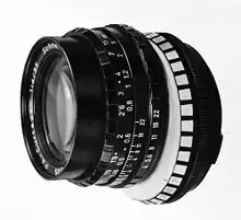 The first PC lens manufactured for an SLR camera in any format was Nikon's 1961 f/3.5 35 mm PC-Nikkor; it was followed by an f/2.8 35 mm PC-Nikkor (1968), an f/4 28 mm PC-Nikkor (1975), and an f/3.5 28 mm PC-Nikkor (1981).[4] In 1973, Canon introduced a lens, the TS 35 mm f/2.8 SSC,[2] with tilt as well as shift functions.