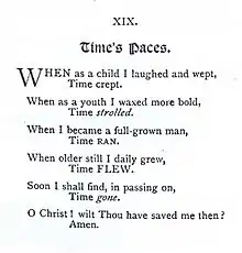 Time's Paces is a poem about the apparent speeding up of time as one gets older. It was written by Henry Twells (1823–1900) and published in his book Hymns and Other Stray Verses (1901). The poem was popularised by Guy Pentreath (1902–1985) in an amended version. Pentreath saw the poem Time's Paces attached to a clock case in the North Transept of Chester Cathedral where it is to be seen today.[1] Recently the poem was even set to music.[2] Pentreath quoted his version of the poem in his last sermon at Wrekin College, Shropshire where he was headmaster till 1952.[3] His version then entered the public domain. Perhaps he wrote the poem down from memory and reconstructed it in the process. He may not have consciously intended to improve on Twells' version.