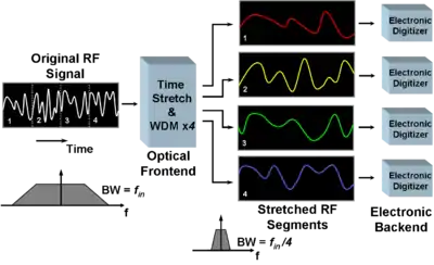 The time-stretch processor, which is generally an optical frontend, stretches the signal in time. It also divides the signal into multiple segments using a filter, for example, a wavelength division multiplexing (WDM) filter, to ensure that the stretched replica of the original analog signal segments do not overlap each other in time after stretching. The time-stretched and slowed down signal segments are then converted into digital samples by slow electronic ADCs. Finally, these samples are collected by a digital signal processor (DSP) and rearranged in a manner such that output data is the digital representation of the original analog signal. Any distortion added to the signal by the time-stretch preprocessor is also removed by the DSP.