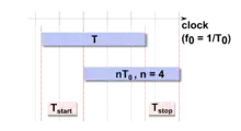 Measuring a time interval using a coarse counter with the averaging method described above is relatively time consuming because of the many repetitions that are needed to determine the probabilities and . In comparison to the other methods described later on, a coarse counter has a very limited resolution (1ns in case of a 1 GHz reference clock), but satisfies with its theoretically unlimited measuring range.
