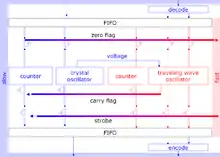 The vernier method is more involved.[13] The method involves a triggerable oscillator[14] and a coincidence circuit. At the event, the integer clock count is stored and the oscillator is started. The triggered oscillator has a slightly different frequency than the clock oscillator. For sake of argument, say the triggered oscillator has a period that is 1 ns faster than the clock. If the event happened 67 ns after the last clock, then the triggered oscillator transition will slide by −1 ns after each subsequent clock pulse. The triggered oscillator will be at 66 ns after the next clock, at 65 ns after the second clock, and so forth. A coincidence detector looks for when the triggered oscillator and the clock transition at the same time, and that indicates the fraction time that needs to be added.
