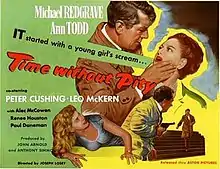 The film was directed by expatriate American Joseph Losey after he was blacklisted in the U.S. during the (McCarthy / McCarthyism) era. Time Without Pity was Losey's second film in Britain and his first under his own name.[1] The film stars Michael Redgrave, Ann Todd, Leo McKern, Paul Daneman, Peter Cushing, Alec McCowen Renee Houston. It was the second film for which British cinematographer Freddie Francis was credited in that craft (the British credit is simply for "photography"). Joan Plowright appears briefly as a feisty chorus girl and Lois Maxwell, the first Miss Moneypenny in the James Bond films, also has a standout scene as a girl who can be bought.