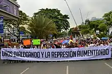 - 18 March – Groups of mothers gathered in Altamira Square and peacefully protested against the situation in Venezuela.[183] Protesters marched to Ramo Verde prison one month after opposition leader Leopoldo López was arrested.[184] During a press conference, President of the National Assembly Diosdado Cabello said that the government accused María Corina Machado of 29 counts of murder due to the deaths resulting from the protests.[185] An 18 years old student dies in Táchira during a shooting, while many other protesters were injured.[186][187] The National Experimental University of the Armed Forces (UNEFA) in San Cristobal, Táchira was attacked with petrol bombs and largely destroyed; the dean blamed far-right groups.[188][189] Municipal services worker Francisco Rosendo Marín was shot in the head while clearing a barricade from a street in Caracas. Claims on social networks blame the attack on an armed group on motorcycles.[189] Panama's ambassador to the OAS, Arturo Vallarino, anticipated in and interview with Voice of America to cede his seat in the Permanent Council of the organization to María Corina Machado to let her talk about the protests.[190][191]
