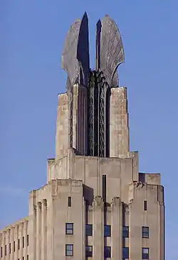 The Times Square Building is an Art Deco skyscraper designed by Ralph Thomas Walker of the firm Voorhees, Gmelin, and Walker located in Rochester, New York, United States. At 260 feet (79 m), it is the eighth-tallest building in Rochester, with 14 floors. The former Genesee Valley Trust Building is a streamlined twelve-story building supporting four aluminum wings 42 feet (13 m) high, known as the "Wings of Progress",[1] each weighing 12,000 pounds (5,400 kg). These structures are among the most distinctive features of the Rochester skyline.[2] The trompe-l’oeil style is used for the decor throughout the building's interior and features various depictions of stylized wheat in reference to Rochester's presence as "the flour city". The building originally hosted a Depression era mural by Carl William Peters (1897-1980) on exhibit from its opening that was later destroyed.[3]