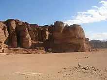 The Timna Valley (תִּמְנָע, Hebrew pronunciation: [timˈna(ʕ)]) is located in southern Israel in the southwestern Arava/Arabah, approximately 30 kilometres (19 mi) north of the Gulf of Aqaba and the city of Eilat. The area is rich in copper ore and has been mined since the 5th millennium BCE. There is controversy whether the mines were active during the biblical united Kingdom of Israel and its second ruler, King Solomon.[1]