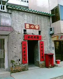 Historic buildings in the village include the Choi Ancestral Hall, also known as Chung Kwong Family Hall (宗光家祠), built around the 1920s,[5] the Leung Ancestral Halls (梁氏祠堂), two ancestral houses, largely rebuilt and occupied by tenants,[7][8] the Liu Ancestral Hall (廖氏祠堂),[5] and the Entrance Gate, built during the Qing Dynasty.[9] Two rectangular holes are above the front doorways of the Gate for feng shui benefit and for security watching.[3]