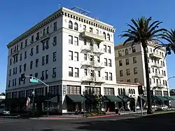 The Tioga Hotel is a historic hotel building located at 1715 N St. in Merced, California. Built in 1928, the hotel is the largest building in Merced. The hotel's architecture reflects the transitional design common in 1920s hotels, which were moving away from the Classical Revival designs used in hotels in the past. In addition, the building boasted Merced's first neon sign. The Tioga Hotel was a grand hotel which hosted prominent guests, including Eleanor Roosevelt, Calvin Coolidge, Mary Pickford, and various foreign royalty. During World War II, the hotel played a role in the war effort; the U.S. Air Force used a floor of the building for offices, and various organizations held wartime fundraisers in its lobby and ballrooms. After the war, manager Gyle Miller returned the hotel to its former prominence; in the following decades, the hotel hosted film stars and served as a center for agricultural trade. The rise of automobile travel ultimately led to the hotel's decline, and it was converted to a residential apartment building.[2]