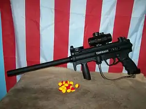 ![]() Tippmann A-5 Basic with aftermarket 12" ceramic barrel by J&J and BSA 30 mm red dot sight. | |