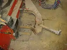 The mount/demount mechanism consists of the duckhead, swing arm, and vertical slide. The duckhead is at the bottom end of the vertical slide. The duckhead is uniquely shaped, like a tapered bill, to fit next and surround the rim of a wheel. It can either be made of metal or plastic. The duckhead mounts and demounts the tire from the wheel.[2] The swing arm moves left and right. The purpose of the swing arm is to move the duck head near or away from the rim. The last component of the mount/demount mechanism is the vertical slide. The vertical slide moves up and down so that the duck head can fit onto the rims of different size wheel widths. The vertical slide has a spring and locking handle above the swing arm to set the duckhead and maintain a stable position around the rim.[2]