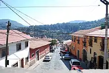 The town proper is small with only 3,704 residents (2005).[1] It is filled with stone paved streets which rise and fall markedly, with the rugged terrain it is built on. Along the streets there are houses with thick walls made of adobe and/or pink sandstone, topped with peaked roofs covered in red tile. A number has wooden balconies and other wood details and look like chalets. The houses are built this way due to the winter months which are cold and sometimes snowy.[2] (decarlan) Surrounding the town are rugged forested mountains.[2] In 2005, Tlalpujahua became the 20th town to be declared a Pueblo Mágico, as part of its efforts to attract tourism. However, it is still quiet with few traffic problems despite the narrow streets.[2][3][4]