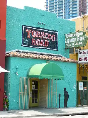 The Tobacco Road was a bar in the Brickell area of Downtown Miami, Florida, United States. It was popularly known as the oldest bar in the city.[1] The liquor license it amended was first issued in November 1912 (though property records show the building as being built in 1915,[2] as a bakery)[3][4] and operated nearly continuously since its opening, having been shut down briefly at times for run-ins with the law, such as when the upstairs, now a live music venue, was used as a speakeasy during Prohibition.[3] Tobacco Road was located at 626 South Miami Avenue, on the south side of the Miami River, putting it in Miami's Brickell district, where it was classified as a classic dive bar, being popular among locals. Tobacco Road celebrated its 100th anniversary in November 2012. In 2012, the land on which Tobacco Road lies was purchased for $12.5 million. On October 26, 2014, Tobacco Road closed and was demolished by Thunder Demolition Inc. An estimated 4,000 people came on its last night.