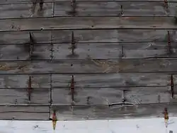 The interior framing would be set up in bents up ten feet,[3] but more often about four feet apart horizontally,[2] so that laths (also called "tobacco sticks") with tobacco attached to them could be hung for drying.[3] The tier poles were often supported by posts and cross beams, the space in between known as the "bents." The bents ranged in vertical spacing from 20 inches to five feet wide. The bent itself became an important earmarker in determining crop volume. Farmers would commonly refer to barn size in terms of bents and the rule of thumb was one bent will hang half an acre of tobacco.[2] In some areas, bents were called "rooms," even though this just defined a narrow and tall division of the inside of the barn by the tier poles. In North Carolina, for instance, bents were called rooms, and a typical barn for curing flue cured tobacco was four rooms in size.