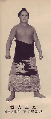 Tochihikari Masayuki (29 August 1933 – 28 March 1977) was a sumo wrestler from Kumamoto Prefecture in Japan who reached the second highest rank of ōzeki in 1962. He joined Kasugano stable in 1952 and reached the top makuuchi division in 1955. He never won a top division championship but was a tournament runner-up four times. He was promoted to ōzeki in May 1962 alongside his stablemate Tochinoumi. He fought as an ōzeki for 22 tournaments but lost the rank after recording three consecutive losing scores and immediately announced his retirement in January 1966. He became an elder of the Japan Sumo Association under the name Chiganoura. He was a judge of tournament bouts and was involved in both the incorrect decision to award a win to Toda that stopped Taiho's 45 bout winning streak in March 1969 and the famous decision in January 1972 to declare Kitanofuji the winner over Takanohana by kabai-te. He died of rectal cancer at the age of 43. His shikona of Tochihikari was subsequently used by a later wrestler from Kasugano stable, also known as Kaneshiro Kofuku.