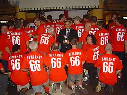 When England were drawn in the same group as Azerbaijan in qualifying for the 2006 FIFA World Cup, a ceremony was held prior to the meeting at the stadium to honor his memory, with attendees including Geoff Hurst, Michel Platini and Sepp Blatter. A statue monument of him was also unveiled at the ceremony and he became the first referee to have a stadium named after him.[11][12] During the same visit, his son Bahram Bahramov met representatives of the English fans and expressed his pleasure that the famous "Russian linesman" of 1966 had finally regained his true nationality. "Now that Azerbaijan is independent it’s very right for him to be remembered as a member of the Azeri nation. People like Tofiq Bahramov are only born once in a hundred years".[13]