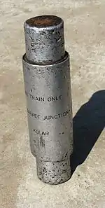 For convenience in passing it from hand to hand, the token was often in the form of a staff, typically 800 mm (31 in) long and 40 mm (1.6 in) diameter, and is referred to as a train staff.[4] Such a staff is usually literally a wooden staff with a brass plate stating the two signal boxes between which it is valid.