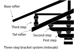 The three-step complex (mitesaki) is the most common in Wayō-style structures.[9] Its third step is usually supported by a so-called tail rafter (尾垂木, odaruki), a cantilever set between the second and the third step (see illustration above and photo in the gallery).[2]