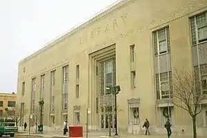 In 1923, Carl Vitz took over as Librarian. He was succeeded in 1937 by Russell Schunk, on whose watch the current Toledo Lucas County Main Library was built. It is on land that was the former home of the Toledo Central High School. The building was designed by the architectural firm of Hahn and Hayes and opened on September 5, 1940.[13] The interior of the building was modeled after the Enoch Pratt Free Library in Baltimore, Maryland. The exterior was modeled on that of Folger Shakespeare Library in Washington, D.C.[10] The one of the interesting features of the building are the vitrolite murals in the Clyde Scoles Historic Court and the Children's Library. The Local History and Genealogy Department was created when the new building opened.