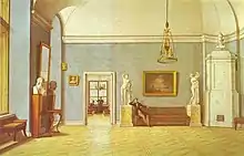 Count Feodor Petrovich Tolstoy (1783–1873), sympathetically mentioned by Pushkin in Eugene Onegin, was one of the most fashionable Russian drawers and painters of the 1820s. Although he prepared fine illustrations for Bogdanovich's Dushenka, his genuine vocation was wax modeling and the design of medals. As he gradually went blind he had to give up drawing and started writing ballets and librettos for operas. He was appointed Vice-President of the Academy of Arts in 1828. Many of his works may be seen in the Russian Museum, St Petersburg.