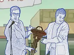 The show features a crude but distinctive limited animation style made by taking photos of the cast with different facial expressions and body language. The photos are then filtered using the "photocopy" image filter in Adobe Photoshop, resulting in monochromatic blue and white images resembling Ditto machine copies. There are some live-action scenes, usually on a television set within the show.[6]