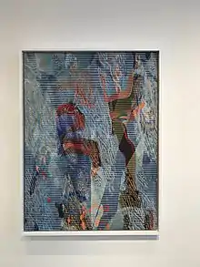 Swimming in My Head is the most involved exhibition I've ever put together and houses one year of painting (13 total). It also marks my transition from collage work to painting on canvas which has unlimited the possibilities of optical patterns and illusions within my paintings through silkscreen processes.[6]