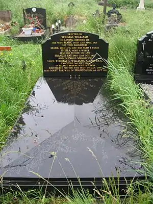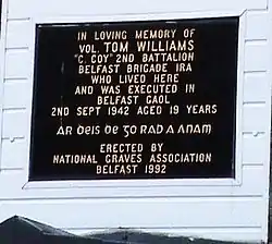 His funeral held on 19 January 2000 was attended by thousands, with Williams buried at Milltown Cemetery.[4] Joe Cahill, Tom's cell mate, and John Oliver, sentenced to death with Tom but later reprieved, as well as Madge McConville, who had been arrested with Tom, Greta McGlone, Billy McKee, Eddie Keenan and perhaps least known, Nell Morgan, Tom's girlfriend at the time of his death, were all present. Six senior Sinn Féin members including Gerry Adams were also present in St Paul's Church on the Lower Falls Road for the Mass. Tom's boyhood friend and the man who introduced him to the Republican Movement, Alfie Hannaway, was unable to attend the funeral due to ill health.[5] Tom's funeral Mass was celebrated by Rev Fr Paddy O'Donnell, C.Ss.R., a Redemptorist Priest from Clonard Monastery.