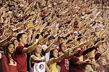 It is not known when the tomahawk chop was invented. However, it is claimed by a former Florida State University president that it was invented by the Florida State University Marching Chiefs in the 1980s to complement their war chants.[4] Another report claims it was first performed in 1984 by students from the inter-fraternal group called “The Scalp-Hunters” behind the FSU band. The action was adopted by fans of the FSU Seminoles over the following years.[5] Despite this, the university's board does not endorse the action stating "Some traditions we cannot control... It's a term we did not choose and officially do not use".[5]