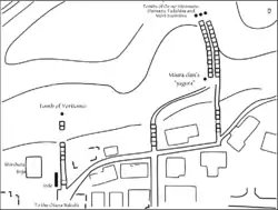 During the Kamakura period in and around Kamakura, for reasons that are unclear, warriors, priests and sometimes even commoners were buried in caves called Yagura carved out of the soft limestone that makes up the hills around the city. Yagura containing a gorintō were sometimes used also as cenotaphs (memorial monuments). The souls of those of the Miura clan who perished during the siege of the neighboring Hokke-dō are enshrined in a small yagura whose opening is barely visible to the left of the base of the twin stairways leading to the tombs of Shimazu Tadahisa and Mōri Suemitsu (see map above).[1] The cenotaph is still tended and visited.