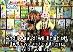 Assoud (Arabic: اسود; also rendered as Assud), a Bugs Bunny or Roger Rabbit-like leporid character whose name means lion, was introduced after his brother, the previous co-host, Nahoul, died of illness.[28] In explaining why he is called Assoud (lion), when Arnoub (rabbit) would be more appropriate, Assoud explains that "A rabbit is a term for a bad person and coward. And I, Assoud, will finish off the Jews and eat them."[27][28] Before Nahoul's death, Assoud lived in Lebanon; he returned "in order to return to the homeland and liberate it."[27] On his deathbed, he instructs Palestinian children that they must fight and die to liberate Haifa, Tel Aviv and other Israeli cities.[29][30] Assoud hinted in episode 302 that he would be replaced by a tiger when he was martyred.