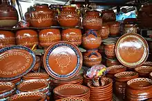 The most visible economic activity is handcrafts, especially pottery. It is a major center for this activity in Jalisco, along with Tlaquepaque.[13] The town has been a ceramics center since the pre Hispanic period.[2][7] The variety include traditional Jalisco varieties from the colonial period such as bruñido, petatillo, bandera, canelo, betus and even bruñido with applications of gold leaf.[1][2] In the 1970s, Ken Edwards and Jorge Wilmot introduced stone ware and high fire ceramics to Tonalá.[7][2] Ceramic pieces include plates, platters, jars, cantaros, cooking pots, flower pots, flower vases, miniatures and other kinds of decorative pieces.[1] One popular design motif in Tonalá ceramics is called the Flor de Tonalá (Tonalá flower), which is an oval center with rounded petals.[7]