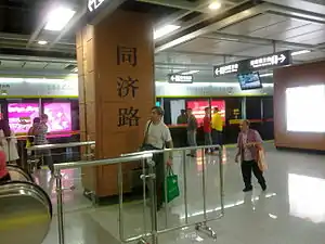Tongji Lu Station (Chinese: 同济路站; lit. 'Tongji Road Station') is a metro station on the Guangfo Line (FMetro Line 1).[1] It is located under the junction of Fenjiang Middle Road (汾江中路) and Tongji Road (同济路) in the Chancheng District of Foshan. The station is near the business areas of Jihua Road (季华路) and the Foshan Ancestral Temple (佛山祖庙), and there are many leisure and entertainment facilities nearby.[2][3] It was completed on 3 November 2010.