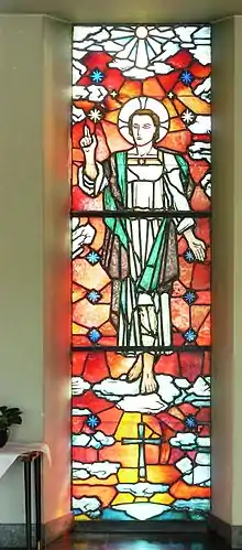 In the porch vestibule at the foot of the bell tower is a stained glass window, created by Bernhard Greve. It shows Jesus standing above a cross. The church bells are cast by Olsen Nauen Bell Foundry.