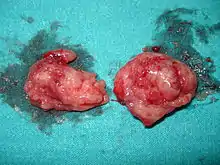 The palatine tonsils can become enlarged (adenotonsillar hyperplasia) or inflamed (tonsillitis). The most common way to treat tonsillitis is with anti-inflammatory drugs such as ibuprofen, or if bacterial in origin, antibiotics, e.g. amoxicillin and azithromycin. Surgical removal (tonsillectomy) may be advised if the tonsils obstruct the airway or interfere with swallowing, or in patients with severe or recurrent tonsillitis.[8][9] However, different mechanisms of pathogenesis for these two subtypes of tonsillar hypertrophy have been described,[10] and may have different responses to identical therapeutic efforts. In older patients, asymmetric tonsils (also known as asymmetric tonsil hypertrophy) may be an indicator of virally infected tonsils, or tumors such as lymphoma or squamous cell carcinoma.