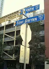 In 2007, a 9½-foot (2.9 m), 1,200-pound (540 kg) bronze statue of Gwynn was unveiled in the park just beyond Petco Park's outfield in an area named Tony Gwynn Plaza.[208][209][210] The address of Petco Park is 19 Tony Gwynn Drive.[208]
