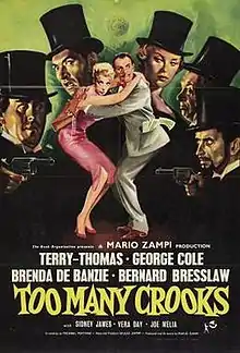 Too Many Crooks is a 1959 British comedy film directed by Mario Zampi. The plot concerns a bunch of inept crooks who kidnap the wife of a shady businessman, only for him to decide he doesn’t want her back.[1] It stars George Cole, Sidney James and Bernard Bresslaw as members of the gang, alongside Brenda de Banzie as the victim and Terry-Thomas as her husband.[2]