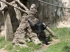 Captive western lowland gorillas have been observed to threaten each other with sticks and larger pieces of wood, while others use sticks for hygienic purposes. Some females have attempted to use logs as ladders.[58] In another group of captive gorillas, several individuals were observed throwing sticks and branches into a tree, apparently to knock down leaves and seeds.[59] Gorillas at Prague zoo have used tools in several ways, including using wood wool as "slippers" when walking on the snow or to cross a wet section of the floor.[29]